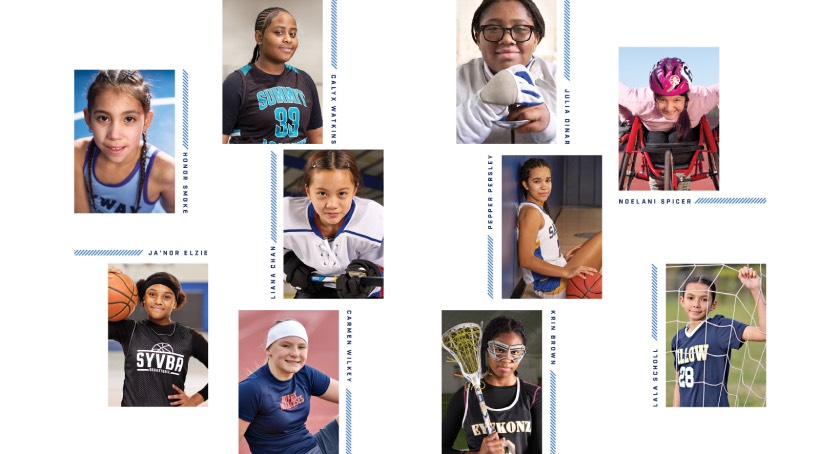 Ja’Nor Elzie, a 12-year-old basketball player from Slidell, LA;Liana Chan, an 11-year-old ice hockey player from New York, NY;Carmen Wilkey, a 12-year-old track and field athlete from Severance, CO;Pepper Persley, a 13-year-old basketball player from New York, NY;Lala Scholl, a 12-year-old soccer player from New Orleans, LA;Noelani Spicer, a 12-year-old track and field para-athlete from San Antonio, TX;Julia Dinar, a 13-year-old fencer from Brooklyn, NY;Calyx Watkins, a 14-year-old basketball player from Detroit, MI; andKrin Brown, a 13-year-old lacrosse player from Philadelphia, PA.