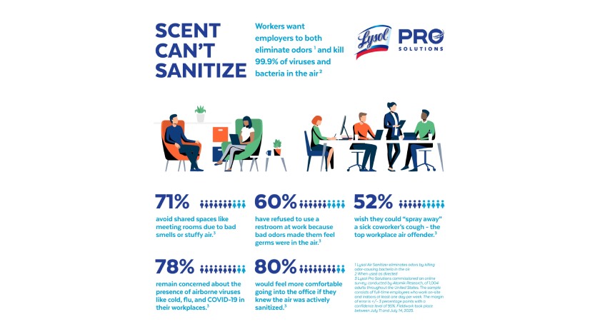 “Our research shows workers are looking for more than just scent when it comes to air care. They want a solution that helps protect their indoor environment from the spread of viruses and bacteria,” said Brian Leafblad, R&D senior manager at Lysol Pro Solutions. “Lysol Air Sanitizer fills a true gap in the market by addressing both the comfort and hygiene expectations employees have. It goes beyond traditional air fresheners’ limitations of simply masking smells and actively targets the viruses and bacteria in the air that people are most worried about, helping organizations support wellbeing and productivity in the workplace.”