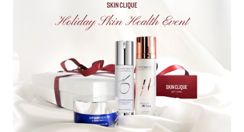 Featured products from Skin Clique’s Holiday Skin Health Event, including giftable skincare essentials from ZO Skin Health and Hydrinity, plus the Skin Clique Gift Card available nationwide.