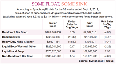 A commodity market, personal cleanser sales at mass marketers, drug stores and supermarkets—the retail locations where most Americans buy what they need to for their daily cleansing rituals—rose 1.23% during the past year, a rate that analysts suggest was hampered by the slow economic recovery in the US. According to SymphonyIRI Group, a Chicago market research firm, for the 52 weeks ended Sept. 9, 2012, sales at those outposts (excluding Walmart) topped $2.1 billion. While shower gels and body washes have been the stars of the business for years, deodorant bar soaps and liquid hand soaps helped to the keep the category’s growth rate from going down the drain. The liquid body wash sector was essentially flat, posting 0.17% growth to $925 million. Meanwhile, sales of deodorant bar soaps rose 5.35% to about $176 million and liquid hand soaps tallied a 4.46% gain to nearly $377 million, according to SymphonyIRI. The biggest sales declines in the personal cleanser category were felt in hand sanitizers and heavy-duty cleaners, which slid 11.3% and 18.5%, respectively (see chart below).